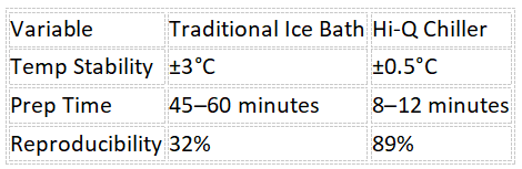 อ่างน้ำแข็งแบบดั้งเดิมกับระบบ Hi-Q:อ่างน้ำแข็งแบบดั้งเดิมสร้างโซนอุณหภูมิที่ไม่สม่ำเสมอ (พื้นผิว: 0 ° C; ด้านล่าง: 8 ° C) นำไปสู่ผลลัพธ์ที่ไม่สอดคล้องกัน การไหลเวียนของกระแสน้ำวนของ Hi-Q ช่วยให้มั่นใจว่าอุณหภูมิน้ำที่เป็นเนื้อเดียวกันเปิดใช้งาน: